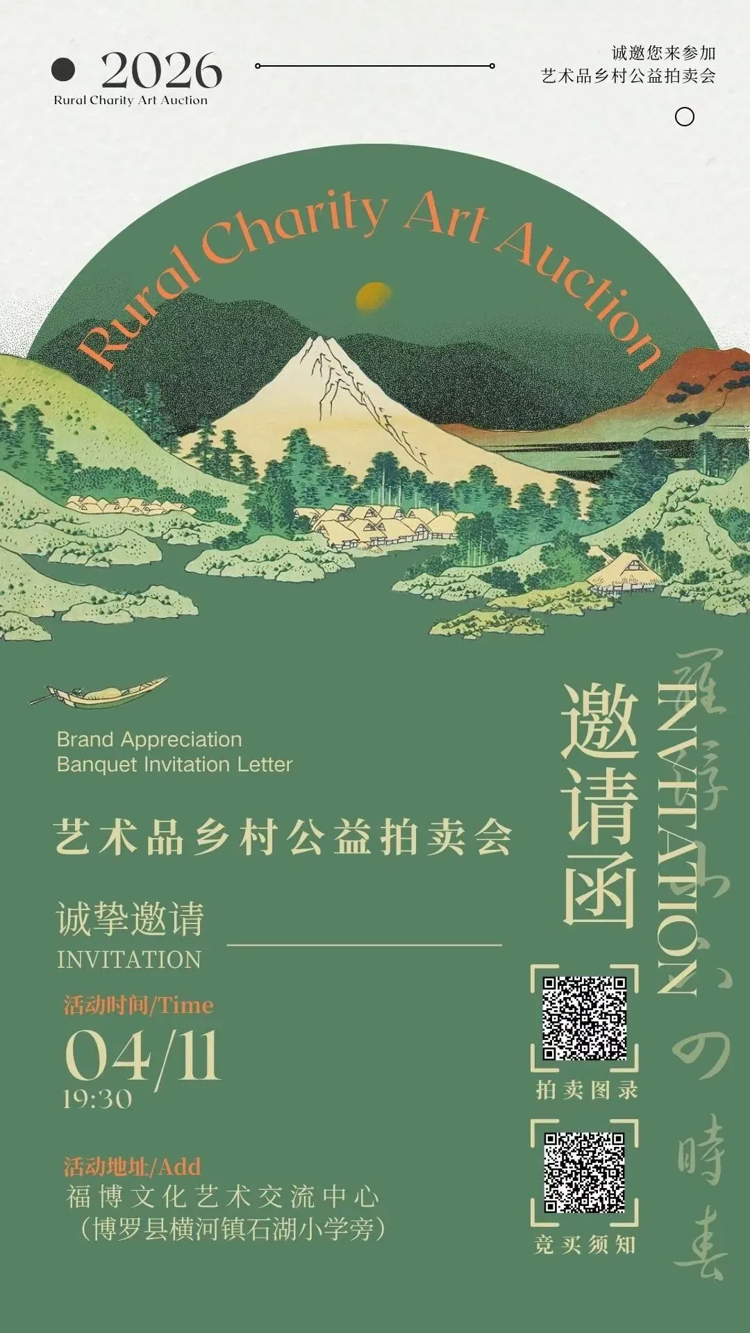 2026年4月11日(周六)晚19:30,福博文化艺术交流中心(博罗县横河镇石湖小学旁),一场别开生面的“艺术品+公益”乡村拍卖活动即将温情启幕。