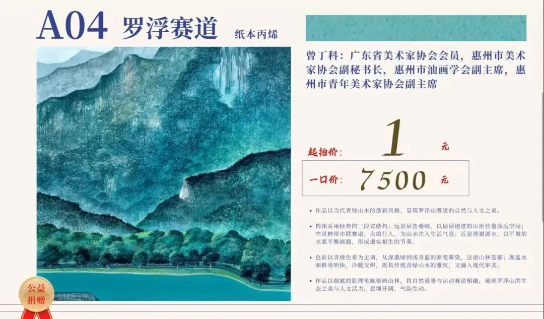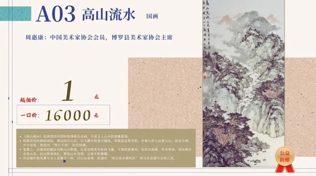 本次公益拍卖,官方背书,权威指导。指导单位为博罗县新时代文明实践基金会,由深圳福田区文学艺术界联合会、惠州博罗县文学艺术界联合会联合主办,惠州嘉麓德文化有限公司、福博文化艺术交流中心承办。