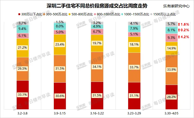 乐有家研究中心数据显示,上周(3.30-4.5)深圳总价800万以上二手房源成交占比合计环比提升了6个百分点。其中,800-1000万区间的占比涨幅最为突出,环比上涨4.2个百分点。同时,1500万以上的豪宅房源成交占比也提升了1.6个百分点。