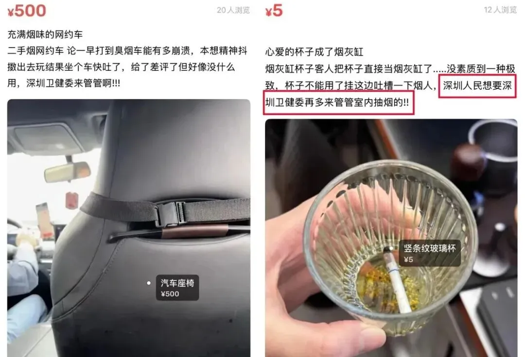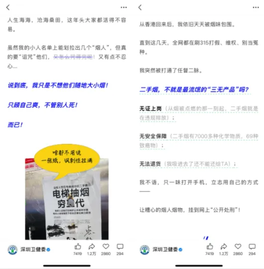 起因是闲鱼空间上线后,很多网友在里面晒出了一系列不文明的抽烟行为,并且顺手@了深圳卫健委,希望官方能管管。