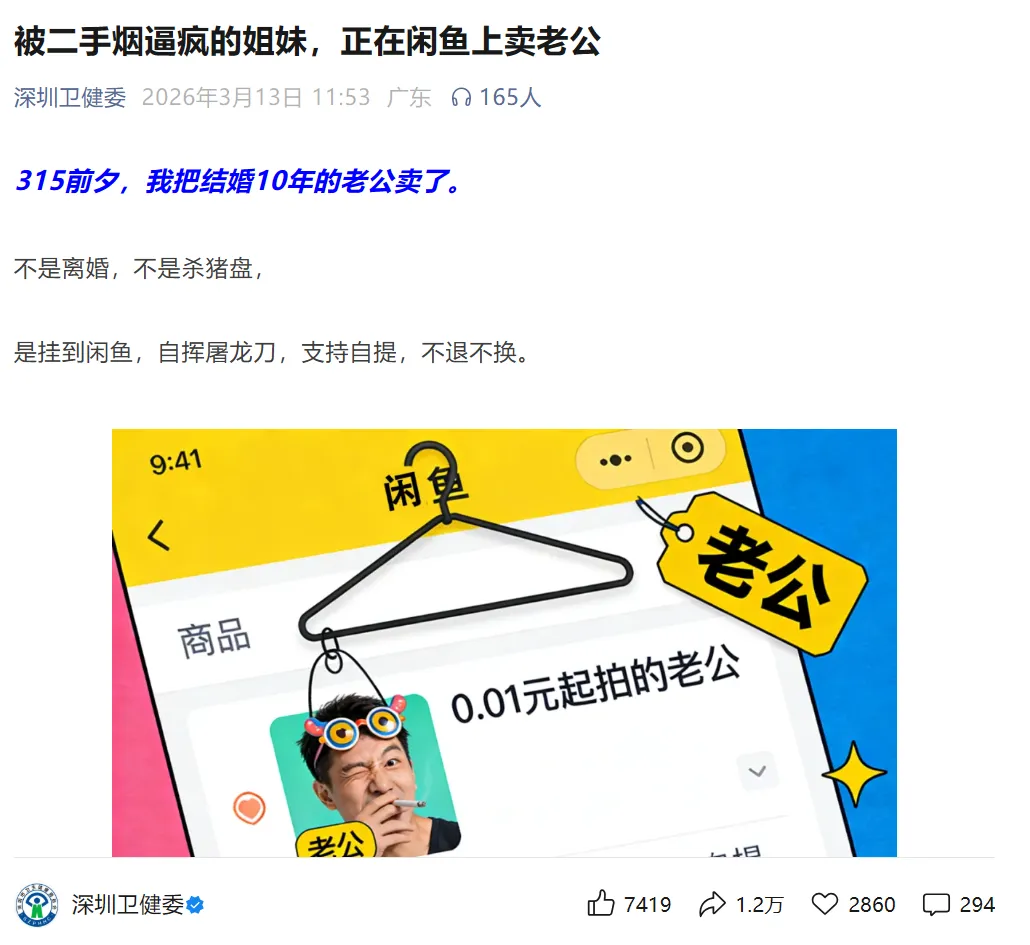没想到,高强度上网冲浪的深圳卫健委不仅看到了,还在自家公众号里直接“开大”回应!标题叫《被二手烟逼疯的姐妹正在闲鱼上卖老公》。