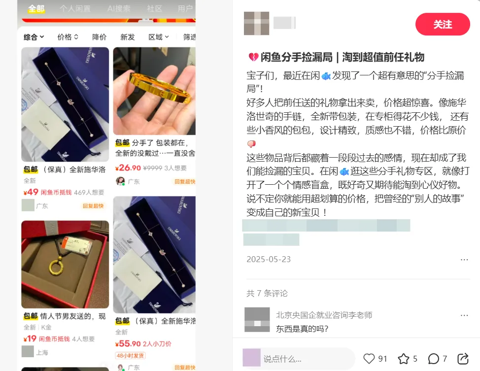 闲鱼靠这种活人感出圈真的不是第一次了。从前几年全网都在卖掉前任的礼物
