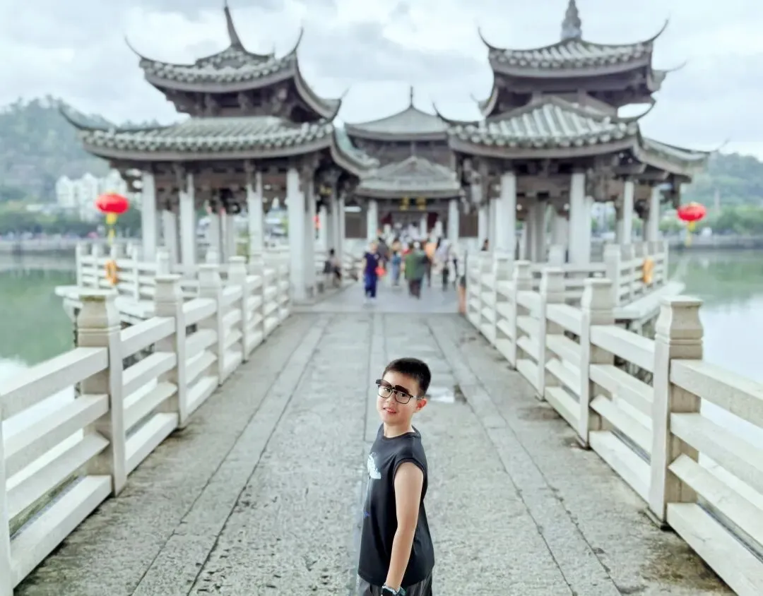 之后,一家人带着祖辈漫步潮汕,站在有着千年历史的广济桥上,杨梓烨觉得“古人太厉害了!这座会‘开合’的古桥,把两边岸连在一起。”