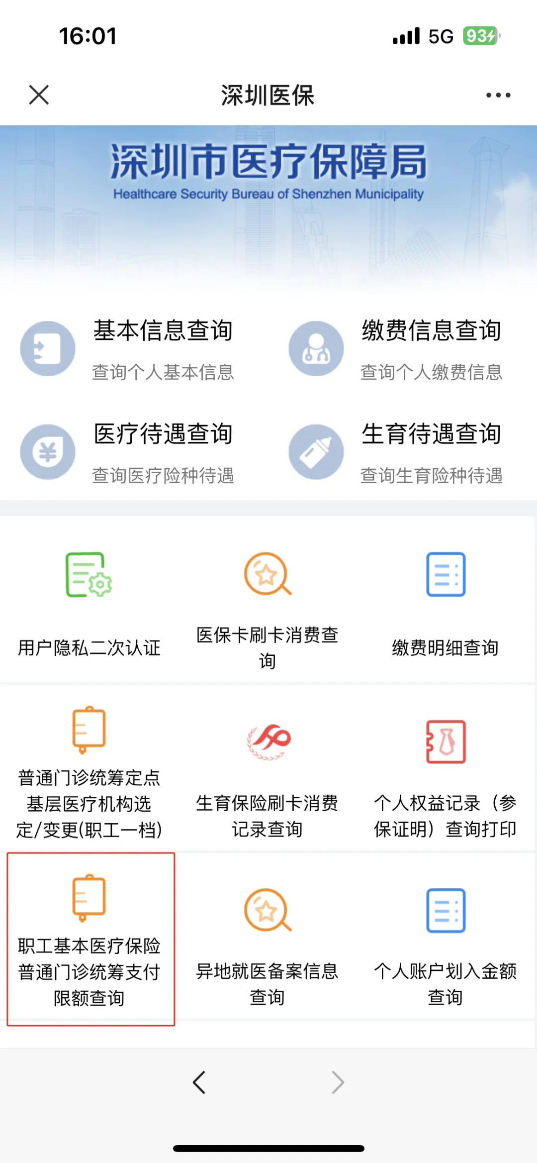 进入“深圳医保”微信公众号,点击菜单栏“掌上政务”→“个人信息查询”,进入信息查询页面后,点击“职工基本医疗保险普通门诊统筹支付限额查询”,选择相应查询年月后点击“查询”即可。