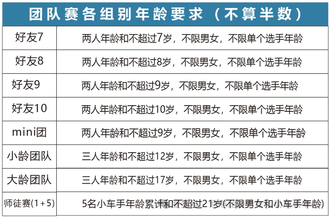 小龄组团队由3人组队而成,3人年龄相加不超出12岁(不算半岁),必须3-4岁(包含3岁)之间小车手组队(每次上场比赛也是3人,3人接力赛模式),3人团队中不限制男女车手;