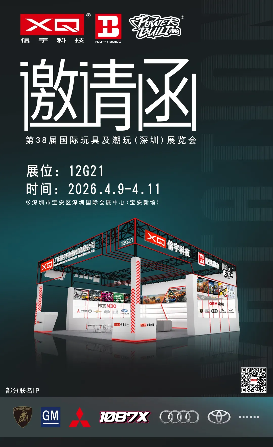 春风有信,潮玩有约!今日,第 38 届国际玩具及潮玩(深圳)展览会在深圳国际会展中心(宝安新馆)正式拉开帷幕。广东信宇科技股份有限公司携旗下品牌:XQ(兰博基尼全球授权遥控车)悦创积木(HAPPY BUILD)品铂(Power Build)伯乐砖(Bole Brick),等全品牌矩阵重磅亮相 12G21 展位,以玩具为媒,以热爱为翼,为全球潮玩爱好者、行业伙伴呈现一场沉浸式的创意盛宴!展会信息:第38届国际玩具以及潮玩(深圳)展览