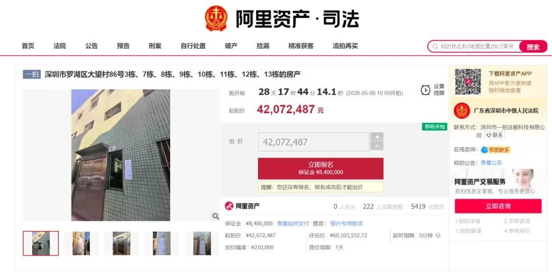由深圳市中级人民法院负责处置的深圳市罗湖区大望村86号3栋、7栋、8栋、9栋、10栋、11栋、12栋、13栋共8栋房产,将于2026年5月6日10时至5月7日10时在阿里资产平台公开竞拍,竞价周期1天,延时周期5分钟。