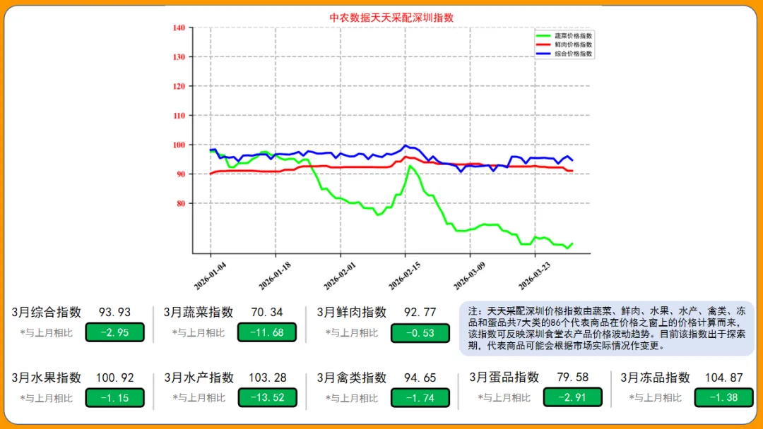据中农数据天天采配平台深圳价格指数统计,2026年3月份,深圳市食堂常用农产品中的重点监测商品的价格综合指数下跌,中农数据天天采配平台深圳价格指数的详细情况如下图所示: