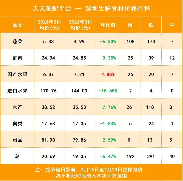 据天天采配平台数据统计,3月份蔬菜、鲜肉、国产水果、水产、禽类、蛋品的价格指数下跌。具体情况如何,让我们一起来看2026年3月生鲜产品价格行情的详细报告。