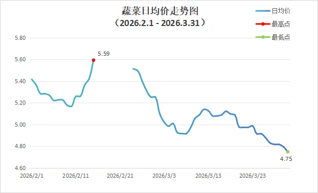 监测数据显示,2026年3月份深圳市场蔬菜整体批发均价为4.99元,较2月份环比下跌6.30%。