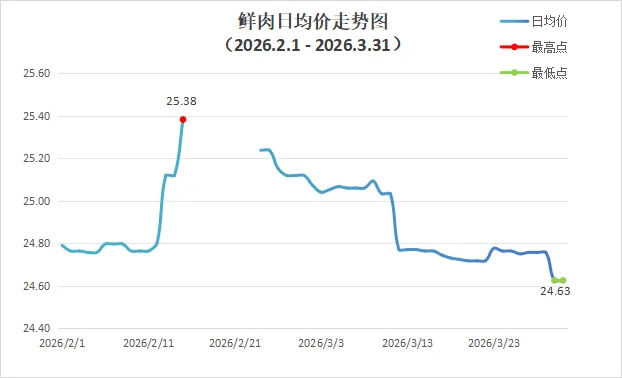 据天天采配平台数据,2026年3月深圳市场鲜肉整体批发均价为24.85元,较2月份下跌0.35%。