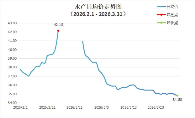 3月份深圳市场水产整体批发均价为35.53元,对比2月份均价环比下跌7.76%。
