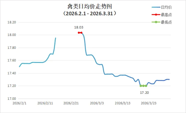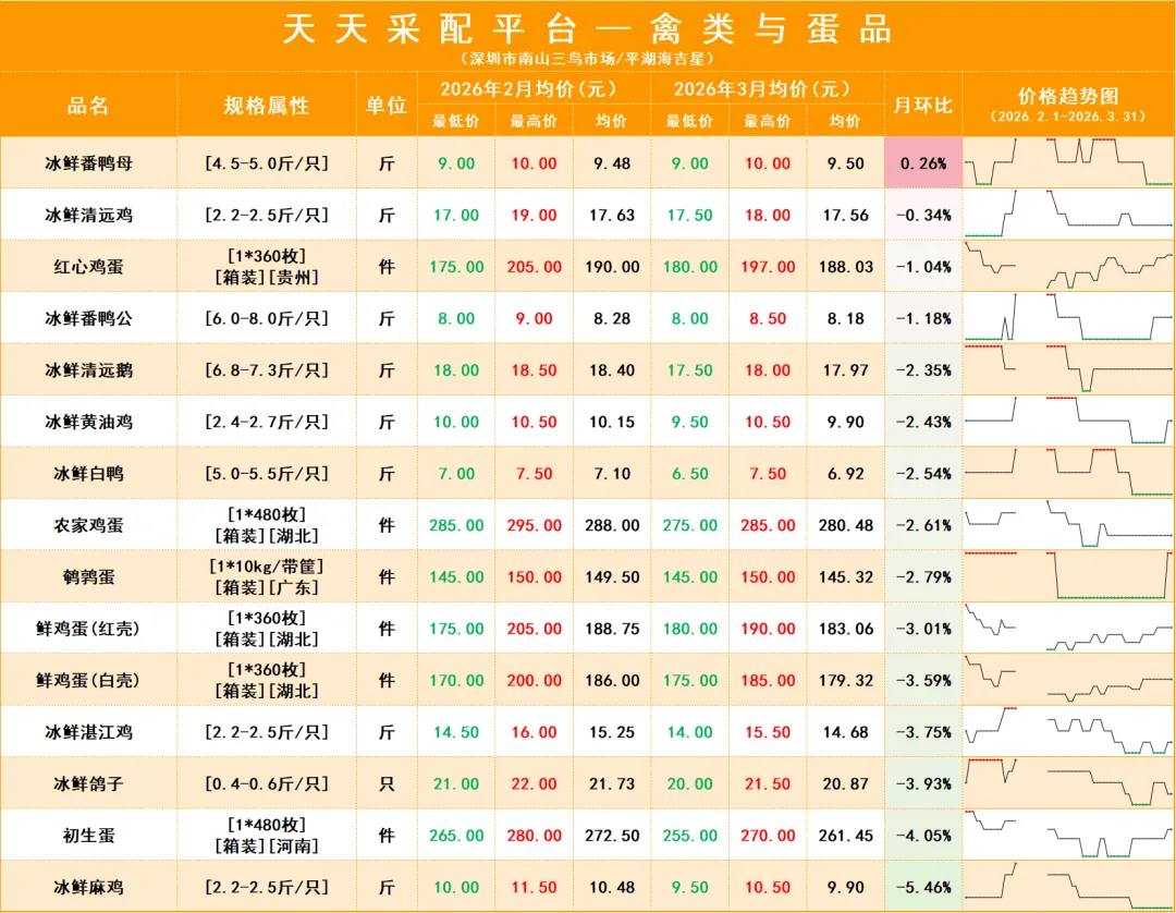 3月份深圳市场禽类商品整体批发均价为17.35元,对比2月份环比下跌1.83%;蛋品2月批发均价为79.86元,环比下跌2.59%。