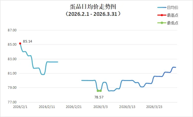 蛋品方面,3月份批发价格呈区间震荡走势,全月批发均价仍低于2月份。其中初生蛋、鲜鸡蛋(白壳)等主流品种批发价格小幅回落,带动蛋品整体价格偏弱运行。