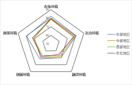 其中,东部地区参评城市中小企业发展生态成熟领先,优质企业培育持续领跑,专精特新“小巨人”企业和专精特新中小企业分别占全国总数量的48.51%和54.95%,比上年增加2.02和8.75个百分点;数字经济与实体经济不断融合,数字化转型成效突出,引领新质生产力快速发展。中部地区参评城市企业权益保护和行政执法规范化水平有较明显提升,数字化转型补贴、贷款贴息等惠企政策覆盖面超过其他区域,追赶势头强劲,但政策兑现效率仍需进一步提高。西部地区参评城市物流服务满意度较上年有较明显提升;反映开展数字化转型的中小企业比例较上年增加8.5个百分点,增幅高于其他区域。但反映多头执法、一刀切执法等问题的企业比例仍高于其他地区,行政执法规范化程度有待提升,创新资源和人才支撑仍显不足。东北地区参评城市市场环境有所改善,政务服务效能稳步提升,不公平竞争现象有所减少,但融资环境仍是明显短板,信贷可得性偏低,数字化转型相对滞后,制约发展动能释放。