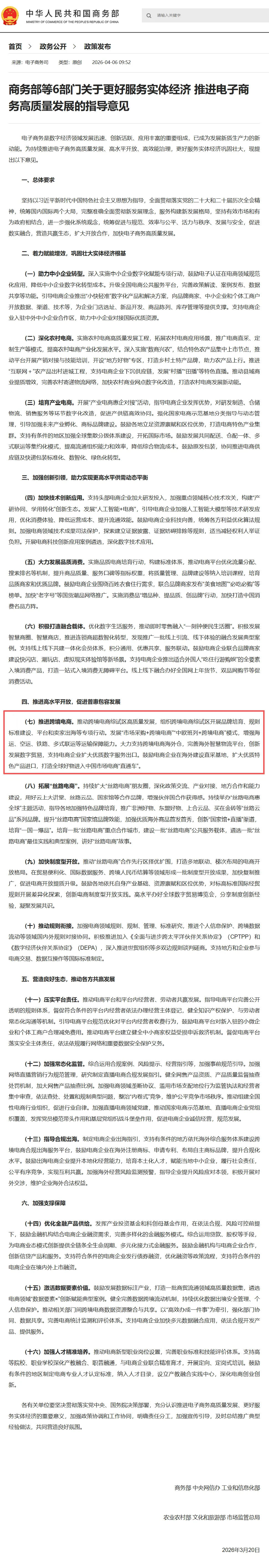 近期,商务部等6部门联合印发《关于更好服务实体经济 推进电子商务高质量发展的指导意见》,该意见提出5方面16条举措,旨在通过电商力量赋能实体经济,推动行业从“高速发展”向“高质量发展”转型。