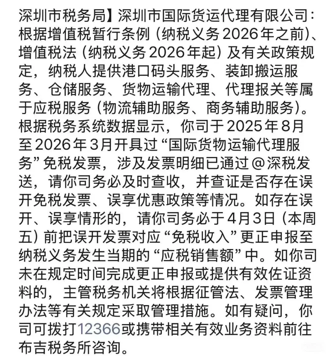 深圳市税务局要求相关货代企业尽快完成对近8个月(即2025年8月至2026年3月)开票及申报数据的全面自查,并明确涉及误享免税的收入须在4月3日前完成更正申报与税款补缴。