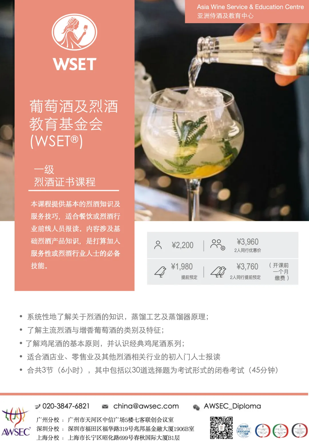 AWSEC是全国最悠久葡萄酒教育机构,全国有香港、广州、上海及深圳四个校区,课程遍布亚洲。AWSEC拥有一流的讲师团队,同时也是香港唯一及亚洲最大的WSET四级文凭课程教育机构,30年来一直坚持严谨的教学理念,提供专业的教育与服务,是亚洲第一家获得“WSET年度最佳教育机构”殊荣的机构,后来更获得“葡萄酒学者”最佳教育机构大奖,以及“意大利葡萄酒学者”最佳教育机构等多种荣誉。
