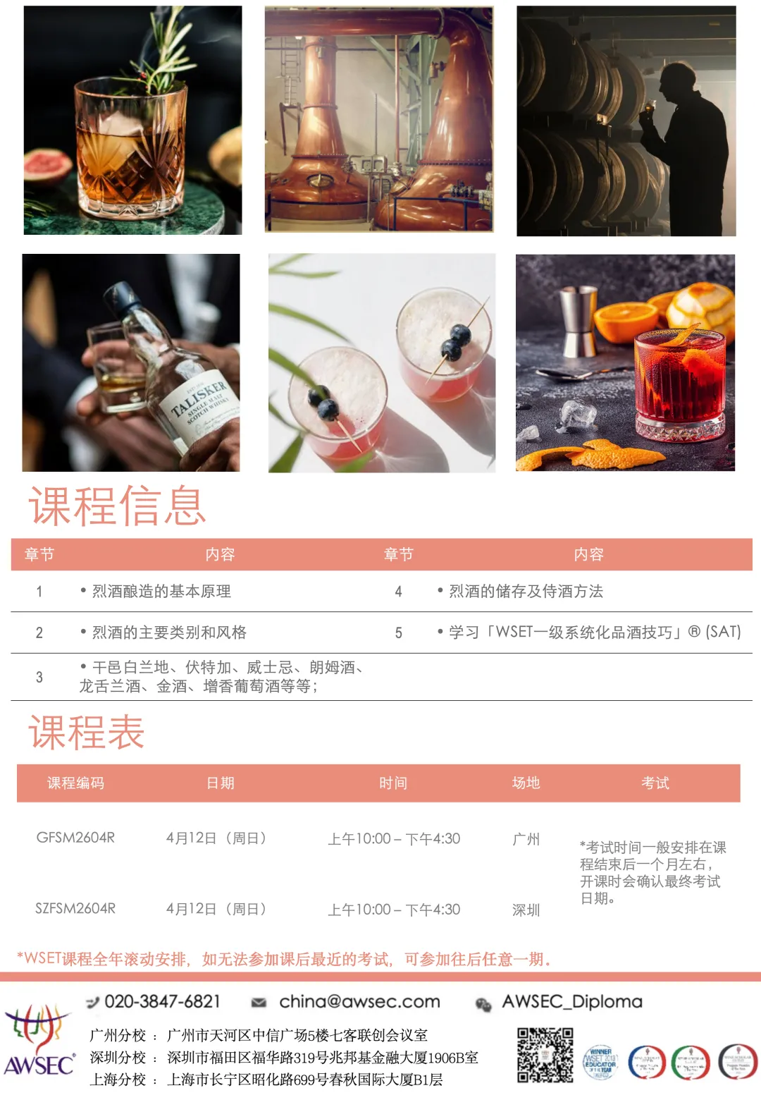 WSET烈酒一级(新版)囊括白兰地、伏特加、威士忌、朗姆酒、Tequila、调味烈酒及利口酒,全面展开学习。WSET一级烈酒认证课程不仅有相关行业人员所需的基础知识和服务技巧,也有行业人士必备的技能。同时更适合烈酒的爱好者,助你摇身转变为资深爱好者。AWSEC除了会教授烈酒知识,更精心准备了Cocktail环节,寓教于乐,课后还能以另一种方式亲近烈酒,用不同的“喝法”诠释烈酒趣味。