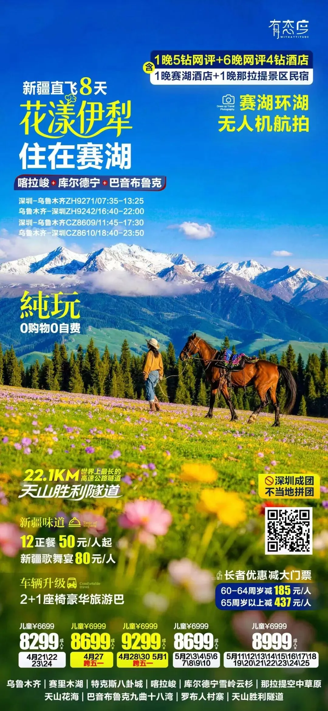 深圳直飞新疆跟团8天旅游团,乌鲁木齐、赛里木湖(含环湖+航拍)、库尔德宁雪岭云杉、那拉提空中草原、天山花海、九曲十八湾、罗布人村寨