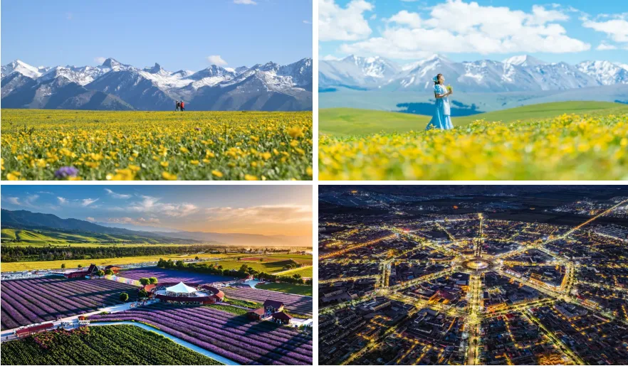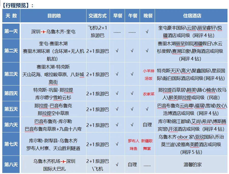 新疆乌鲁木齐、赛里木湖(含环湖+航拍)、特克斯八卦城、喀拉峻、库尔德宁雪岭云杉、那拉提空中草原、天山花海、巴音布鲁克九曲十八湾、罗布人村寨、天山胜利隧道双飞8天