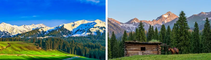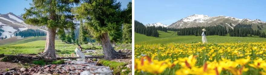 【行程安排】酒店早餐后,乘车前往世界自然遗产地【库尔德宁风景区】(含门票+区间车),为西天山自然保护区,拥有天山特有物种--雪岭云杉,是全球雪岭云杉和中亚野果林的生境区和起源地,是“天山绿谷,雪岭云杉的故乡”。这里的草是嫩到掐得出水的绿,云杉是笔挺的深绿,溪流是裹着碎光的翡翠色,连空气里都飘着青草混着松针的清香——原来真的有地方,能把夏天的浪漫具象成一幅流动的画。