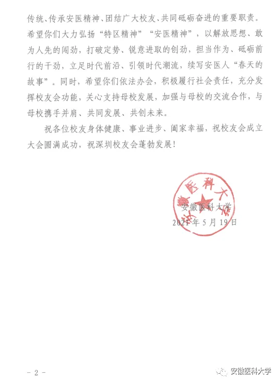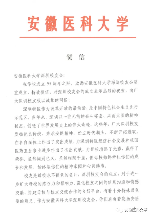 由于疫情防控的原因,安徽医科大学校领导无法亲临会议现场,特致贺信,祝贺深圳校友会的成立,并提出殷切希望。母校的贺信宛如一封家书,有叮咛、有嘱托、有希望、有提醒,在深校友深受鼓舞,一致表示将谨记“好学力行,造就良医”的校训,努力奋斗,服务于粤港澳大湾区医药健康事业的发展,为学校争光。