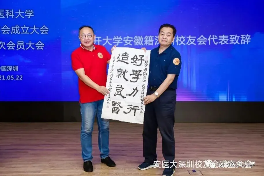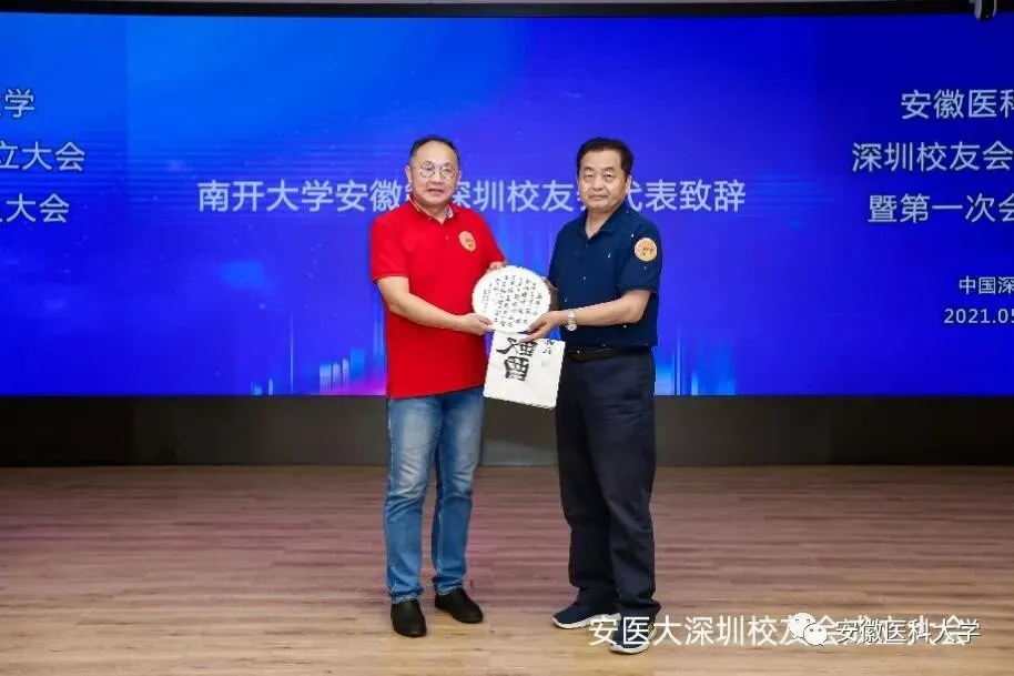 南开大学深圳校友会向安医大深圳校友会赠送了安医大校训的书法作品和南开大学纪念品。