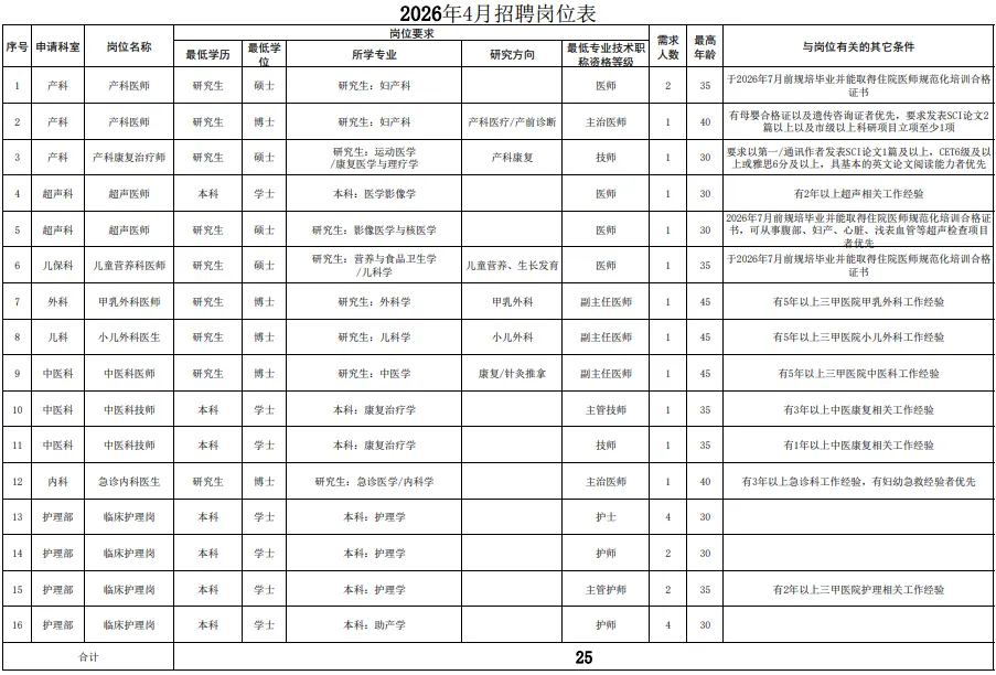 根据医院业务发展需要,现按照"公开、平等、竞争、择优"的原则,面向社会公开招聘下列岗位人员,现将有关事项公告如下: