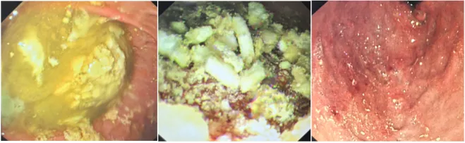 食管管腔里遍布黄色药渣残留,胃底更是被一大团质软易碎的黄色团块堵得严严实实,那正是150余片药凝结成的“药石”。