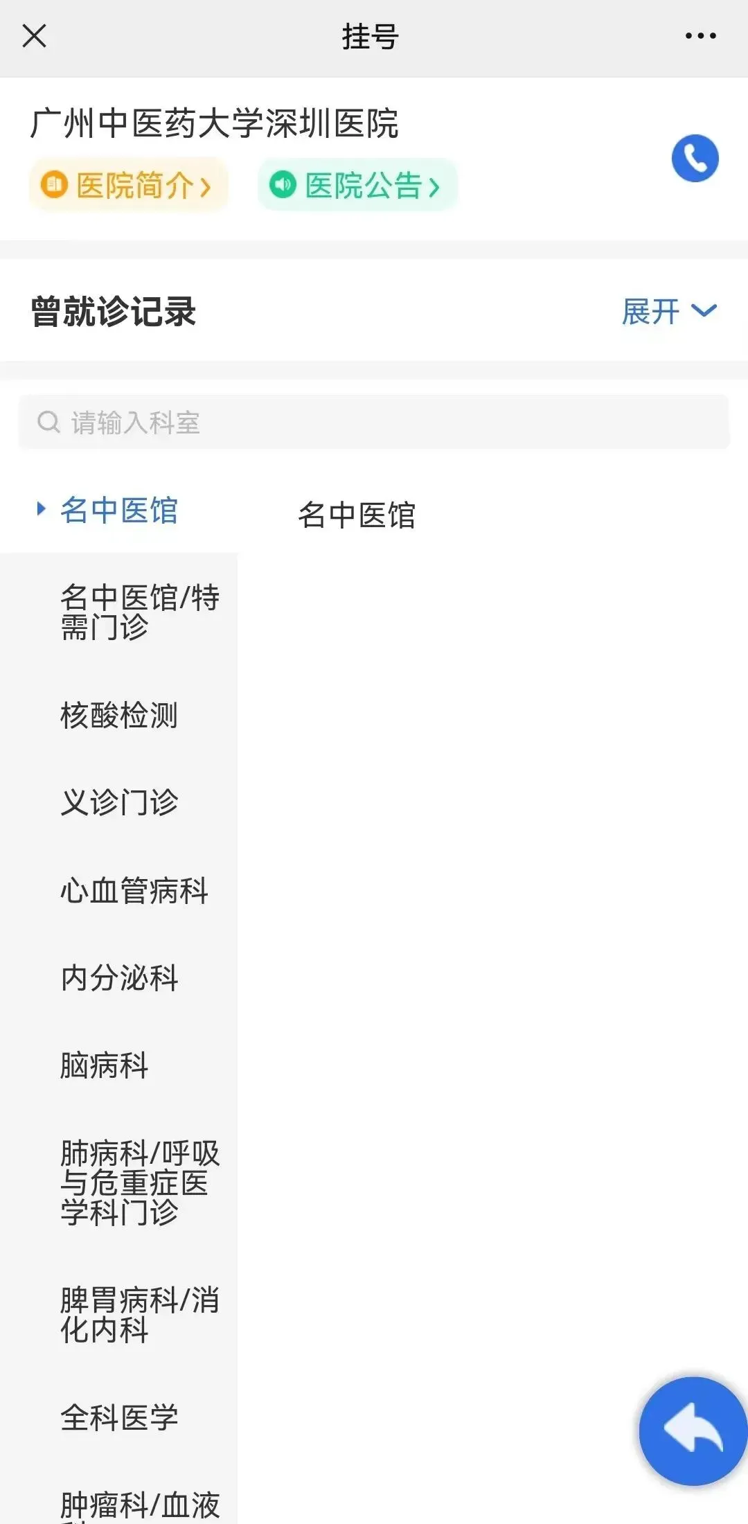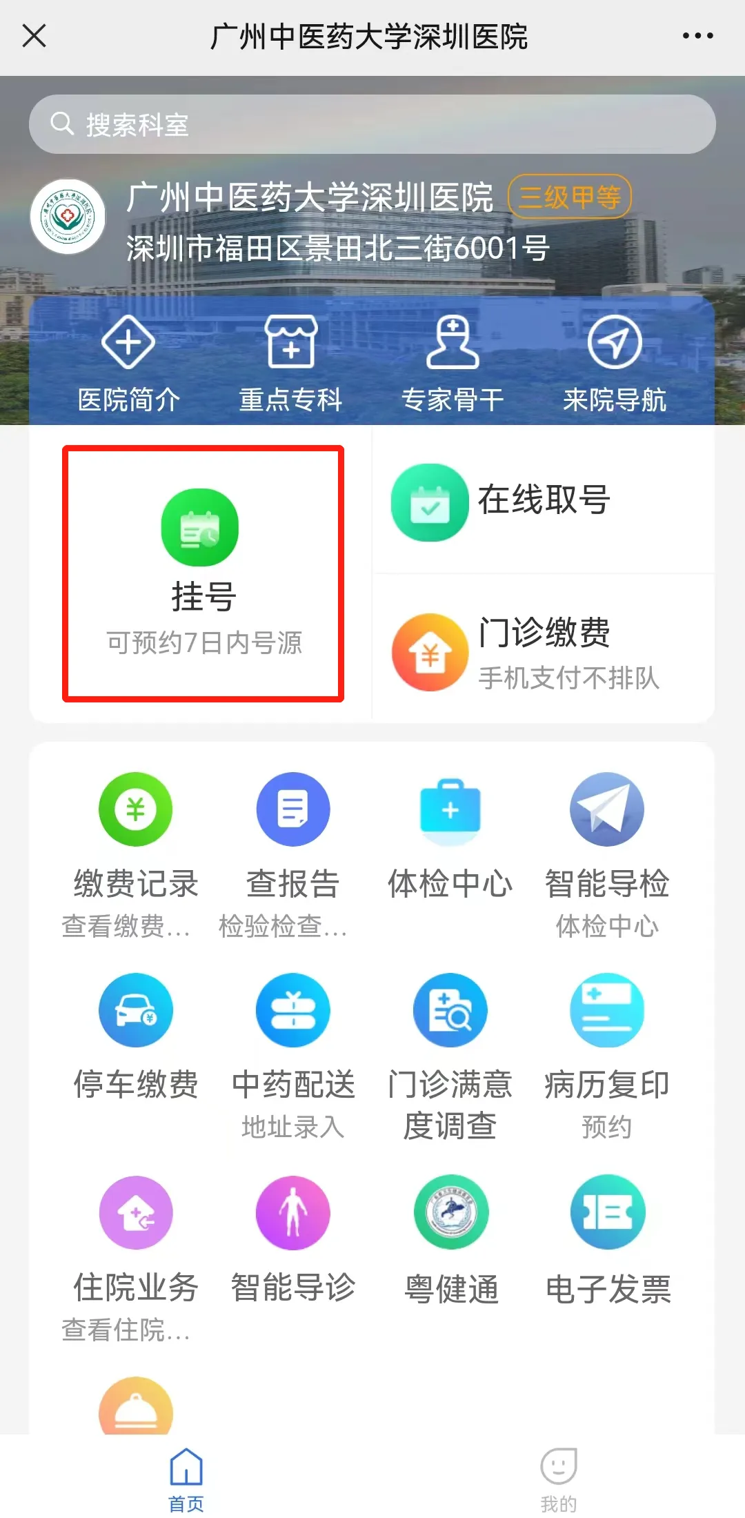 1.关注公众号“广州中医药大学深圳医院”,选择菜单栏“智慧医院”。