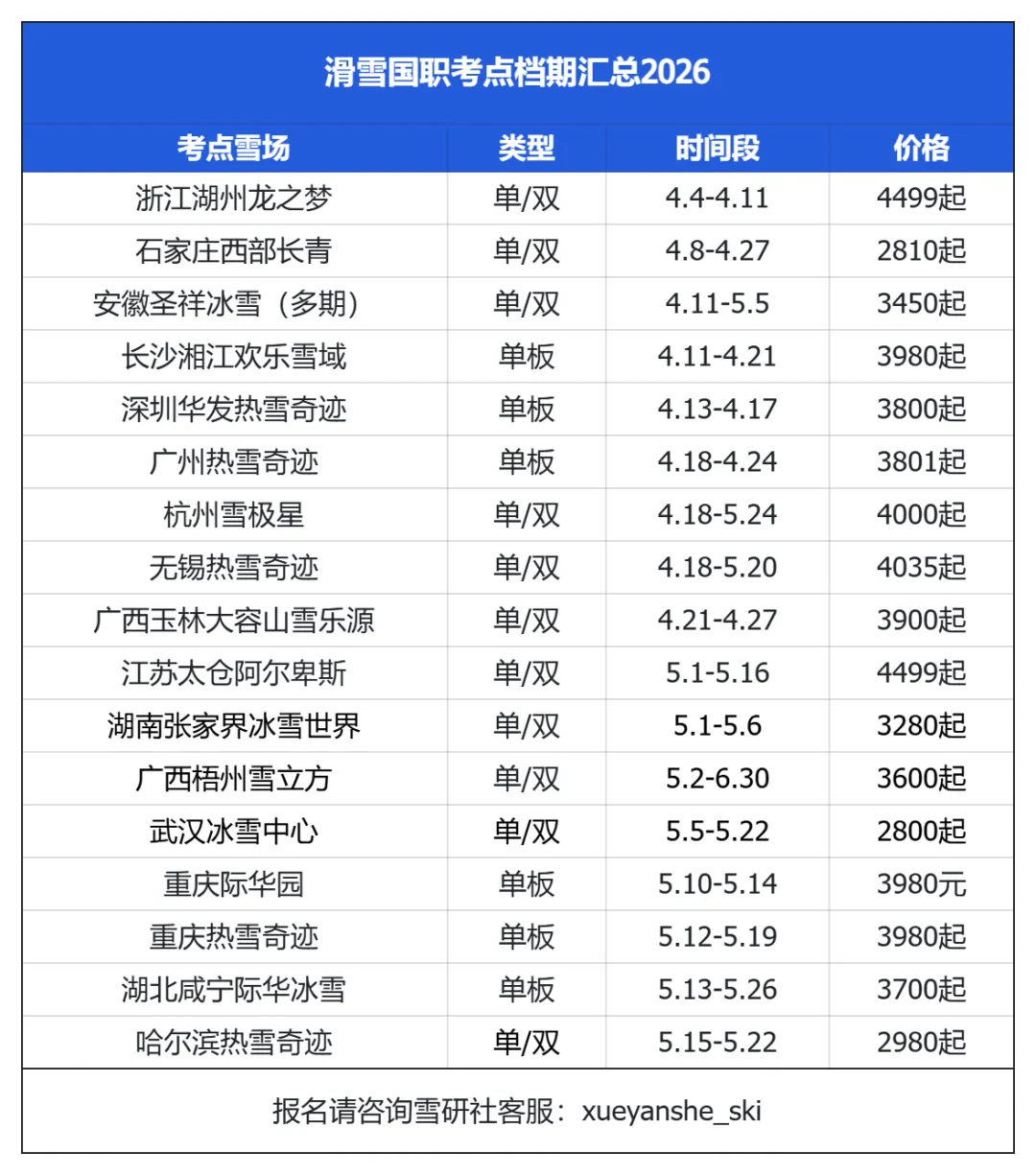 - 单板等级班:每周4-周日培训(只学习滑行技术,无考试),2500元
