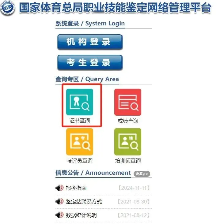 第一步:登录“国家体育总局职业技能鉴定网络管理平台”(网址:https://www.sportosta.org.cn),点击“证书查询”。