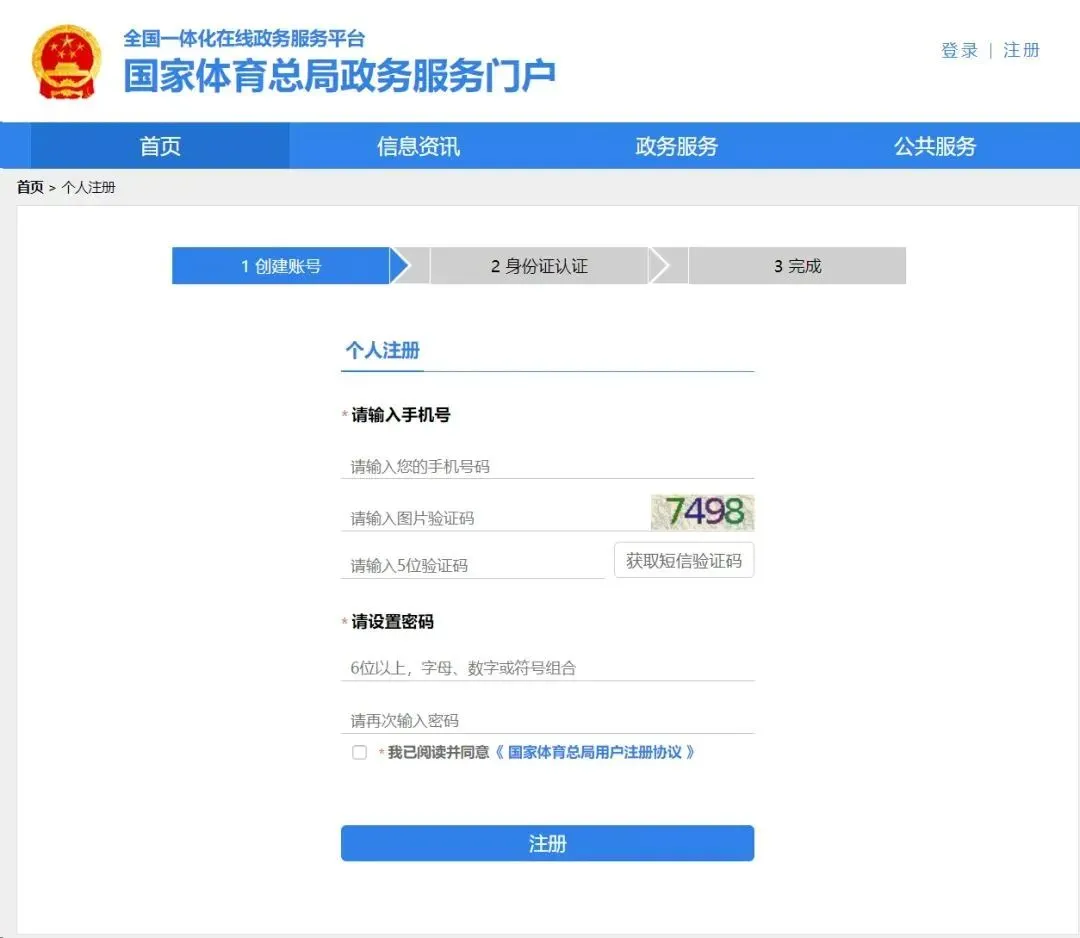 第一步:登录国家体育总局政务服务网(网址:https://zwfw.sport.gov.cn ),在首页完成注册/登录。