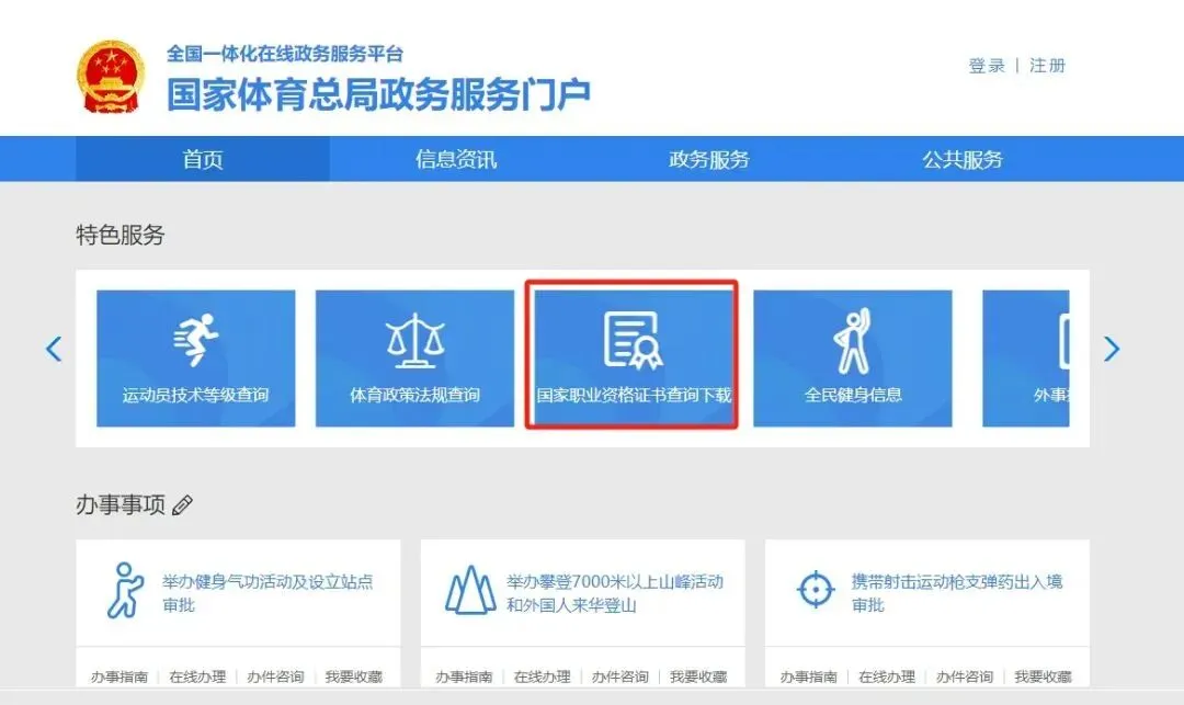 第一步:登录“国家体育总局政务服务网”(网址:https://zwfw.sport.gov.cn),点击“国家职业资格证书查询下载”。