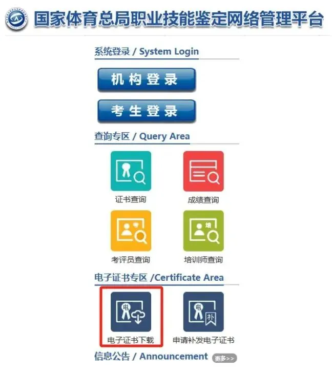 第一步:登录国家体育总局职业技能鉴定网络管理平台(网址:https://www.sportosta.org.cn),点击“电子证书下载”。