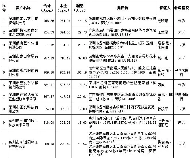 万元。债务人及抵押物所在地为深圳、惠州。