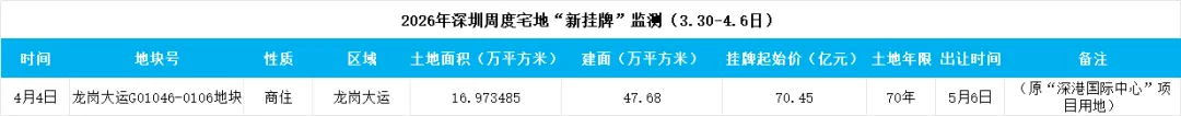 4月6日消息,近日监测到,曾经的龙岗大运地标商住地“收储调规后”重新挂牌,这次起拍价70亿元,预计将是今年目前挂牌总价最高的地块。按照不设上限,竞地价,价高者得来确定竞得人。其预计5月6日出让,届时将给5月的板块市场带来热度的提升。