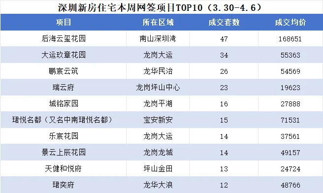 本周(3.30-4.6)深圳新房住宅楼盘网签成交榜单集中在深圳湾、龙岗、龙华、宝安为主,TOP10总成交为214套,环比上周218套小幅下降。其中以后海云玺花园(47套)、大运玖章花园(34套)、鹏宸云筑(26套)为前三。前10楼盘平均成交均价为5.578万元/平方,环比上涨4.88万元/平方,上涨7000元/平。珺奕府、珺悦名都等楼盘也进入榜单。大运玖章花园、瑞云府、城铭家园这些盘均为新晋的热盘。比如后海云玺花园、天健瑞云府(备案名:瑞云府)这些均为今年3月新预售加推的楼盘,正进入成交热榜。