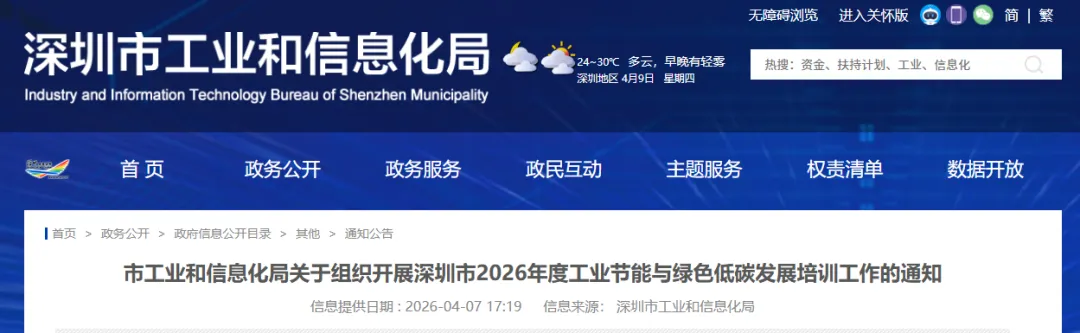 2026年度计划举办工业节能与绿色低碳发展培训18期,培训对象为深圳市工业企业节能管理人员,培训计划详见附件。每期培训启动前,培训机构将通过深圳节能在线“宣传培训”板块(https://wb.gxj.sz.gov.cn/szjnzx/#/xcpx/index)发布培训通知,明确具体培训内容、时间、地点及报名方式,意向参训人员可提前联系培训机构获取培训信息并按要求报名参加。培训不收取任何费用,学员参加培训的交通、食宿等费用自理。
