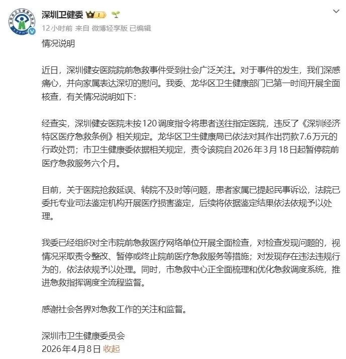 经查实,深圳健安医院未按120调度指令将患者送往指定医院,违反了《深圳经济特区医疗急救条例》相关规定。龙华区卫生健康局已依法对其作出罚款7.6万元的行政处罚;市卫生健康委依据相关规定,责令该院自2026年3月18日起暂停院前医疗急救服务六个月。