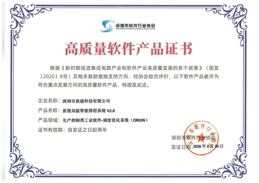 公司自主研发的、深度融合复杂算法的高级智能排程一体化系统(APS),拥有两项发明专利,并荣获深圳市软件行业协会授予的“高质量软件产品”称号。该系统已在山东华盛橡胶集团成功落地,一举成为国内生产制造领域(行业公认最难之一)首个且唯一攻克复杂生产排程难题的标杆案例。