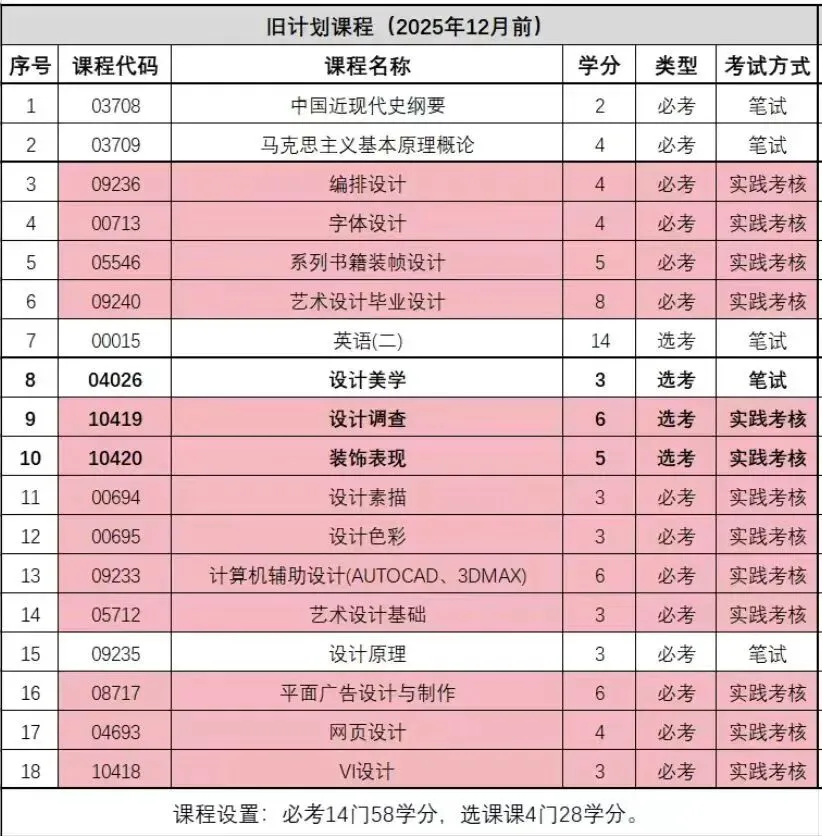 多数科目以作品集、机考或设计项目考核(如《平面广告设计与制作》《系列书籍装帧设计》)。