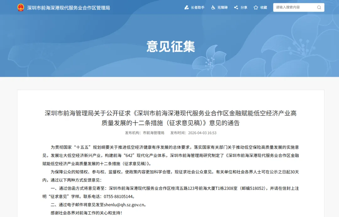 4月3日,深圳市前海管理局于官网发布《深圳市前海深港现代服务业合作区金融赋能低空经济产业高质量发展的十二条措施(征求意见稿)》意见的通告。当前,低空经济作为国家新兴支柱产业,成为推动经济转型升级、培育新质生产力的重要抓手,深港两地正加快推进跨境低空经济协同发展,在前海打造低空经济产业集聚高地成为重要方向。
