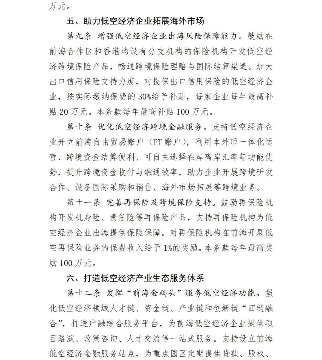 针对低空经济企业出海面临的风险高、跨境资金结算不便等问题,强化出口信用保险保障,对投保出口信保的企业按保费30%给予补贴。支持企业开立前海自由贸易账户(FT账户),便利跨境资金收付与融通。鼓励再保险机构开发适配低空经济企业的再保险产品,对低空保险再保费给予奖励,通过“出口险补贴+跨境金融便利+再保险支持”,全方位助力低空经济企业拓展海外市场,提升国际竞争力。