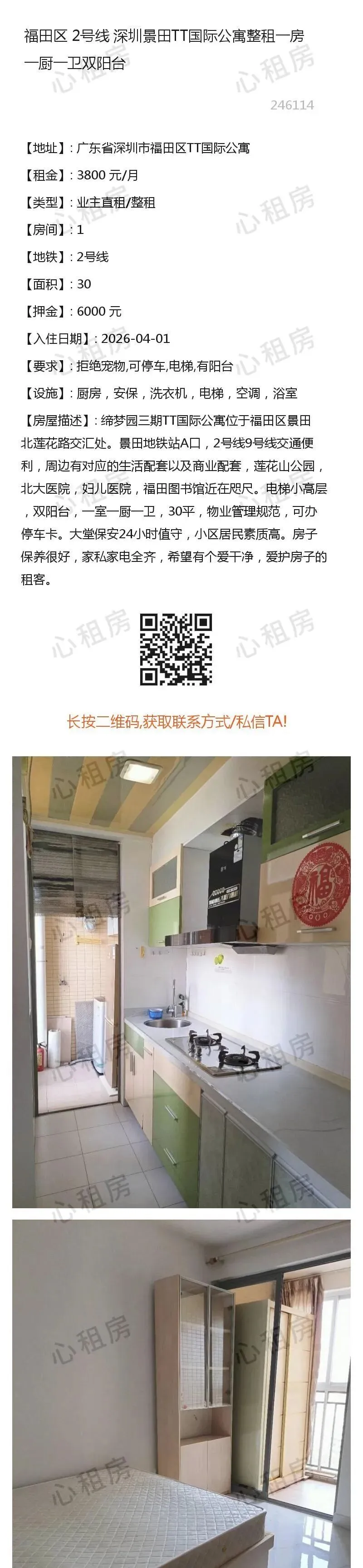 深圳租房>>福田区2号线深圳景田TT国际公寓整租一房一厨一卫双阳台3800元/月