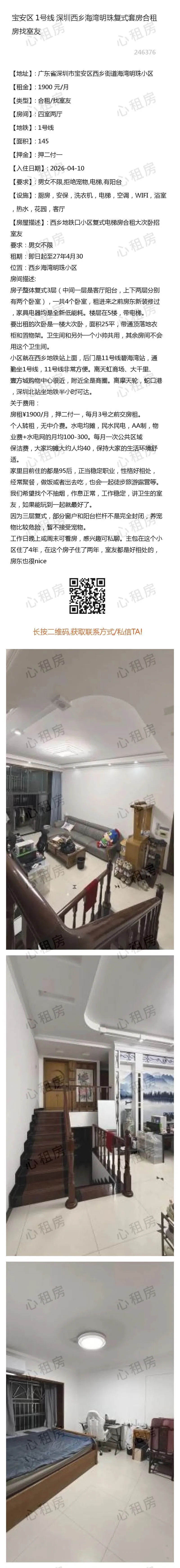 深圳租房>>宝安区1号线深圳西乡海湾明珠复式套房合租房找室友1900元/月