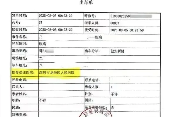 2025 年 8 月 5 日凌晨,深圳市民张女士突发腹痛拨打 120 急救,调度指令明确要求将其送往距离更近、救治能力更强的龙华区人民医院。然而,执行任务的深圳健安医院救护车却擅自改道,将患者拉至自身所属的民营医院。在家属多次下跪哀求转院的情况下,患者被滞留近 8 小时,最终于当日 17 时 42 分因脾动脉瘤破裂出血、失血性休克等 13 项危重状况抢救无效死亡。