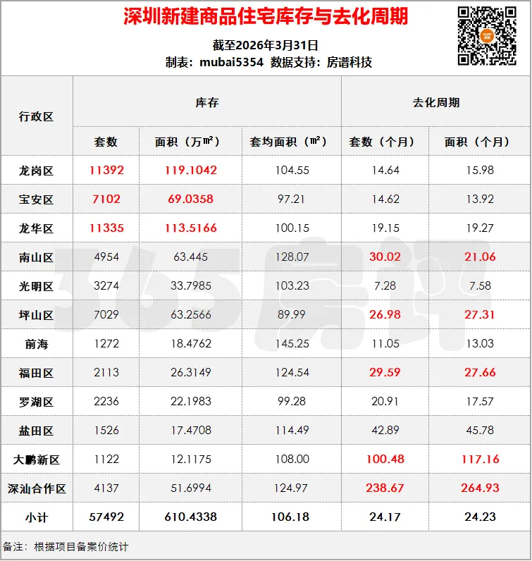 截至2026年3月31日,全市新建商品住宅库存57492套,610.4338万平方米, 套均面积106.18,库存量下降,但去化周期上升明显,目前已经超过24个月。