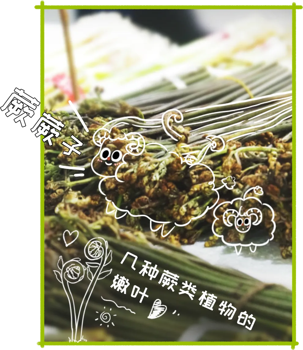 南北不同蕨(大部分时候是碗蕨科植物蕨的嫩叶,南方地区也有乌毛蕨的嫩叶),千万别自己野采,蕨类植物多种长相相似,采错了有毒,且相似保护植物也多,采了面临违法风险;再说野外不乱采植物应该是有素质人群的生态文明共识。